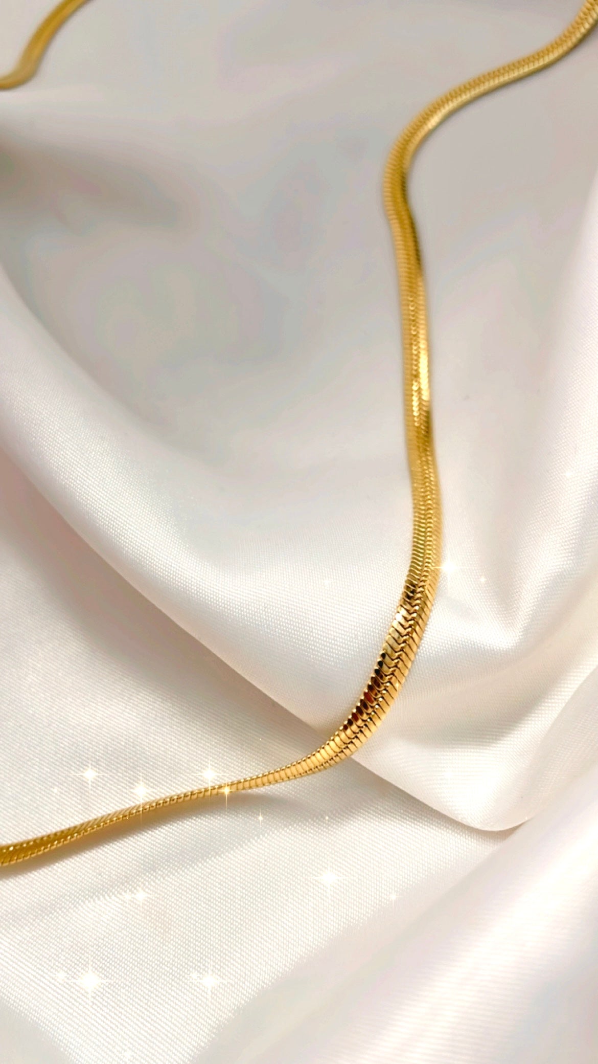 Esta cadena plana, tejido de víbora te ayudará a estilizar tu cuello haciéndolo ver más largo, le dará marco a todo tu layering estilizando tu cuello. ¡Es perfecto!